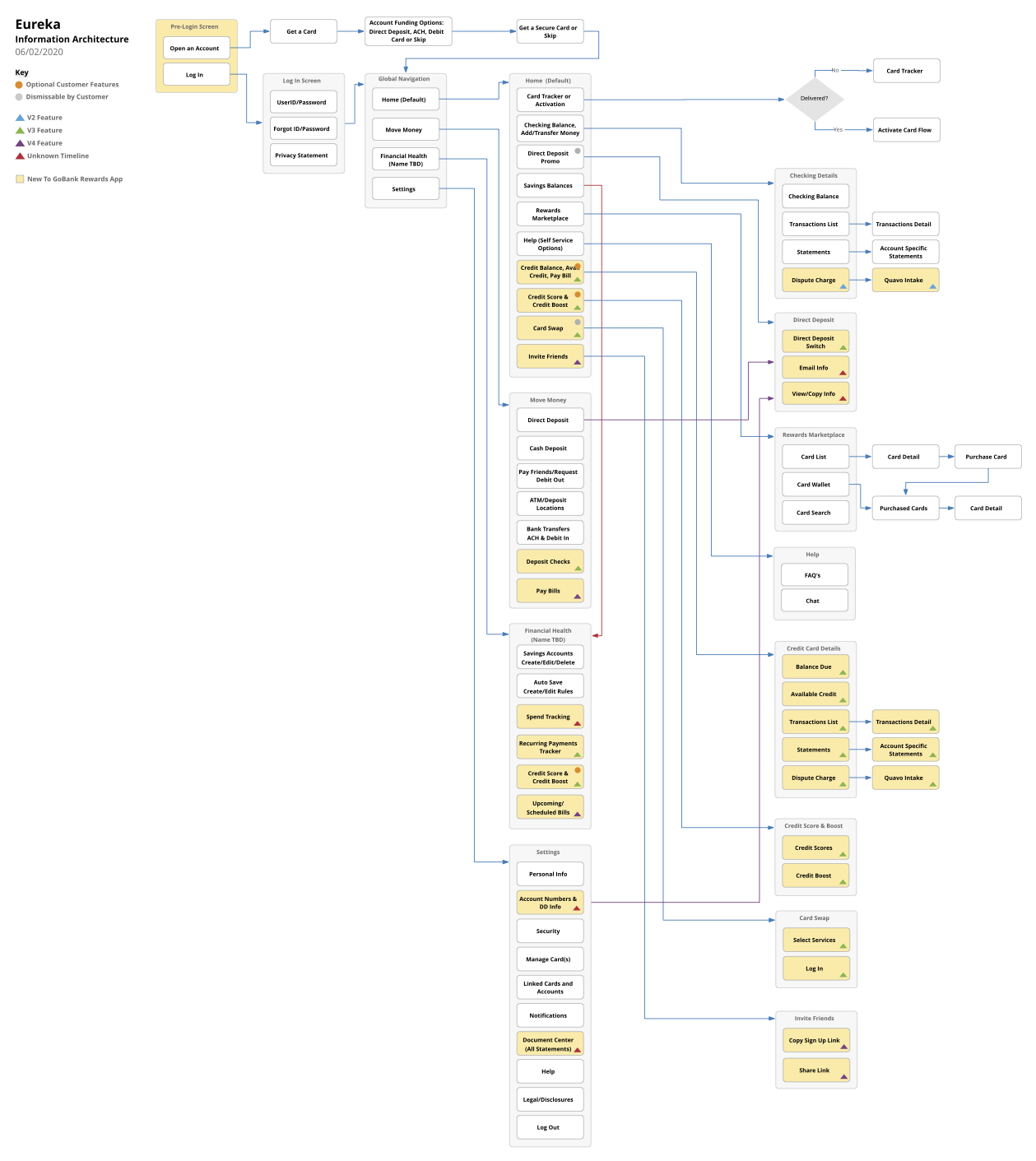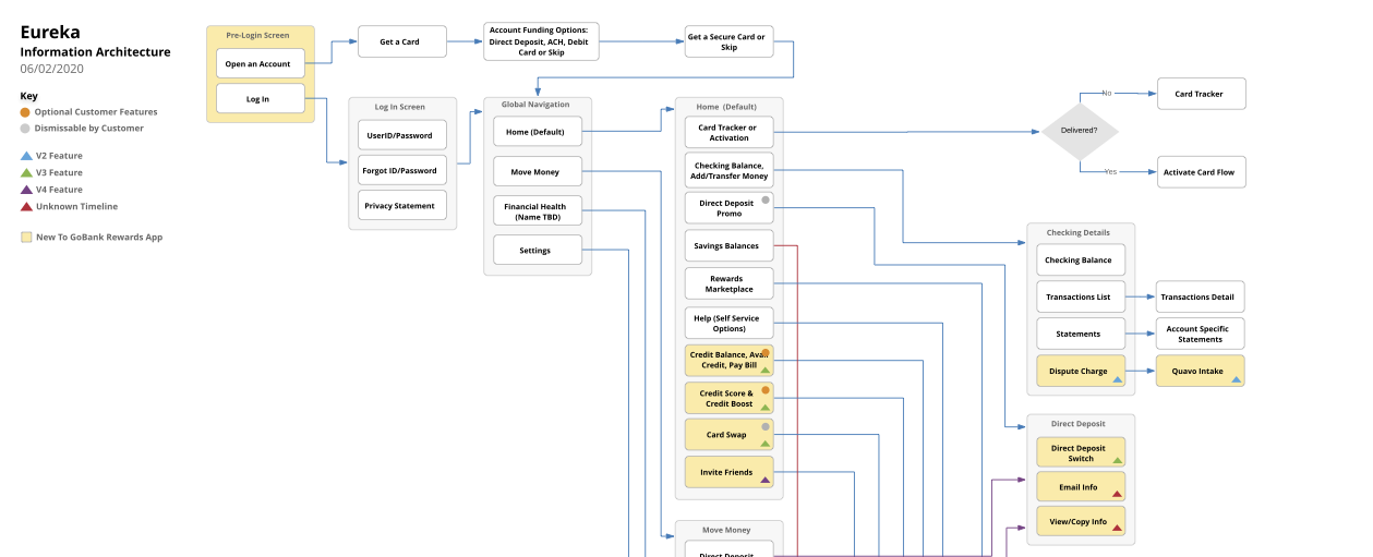 I started by identifying with business and product what features would be available at launch and which features would come later. I produced an IA map of features and a navigation structure for us to guide the initial designs, with room to grow the app for the next few years. Testing results for this IA came back very positive.