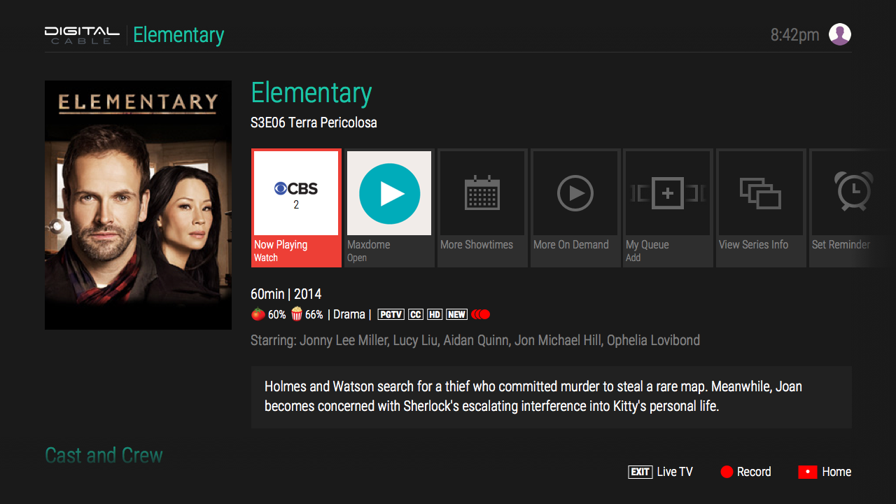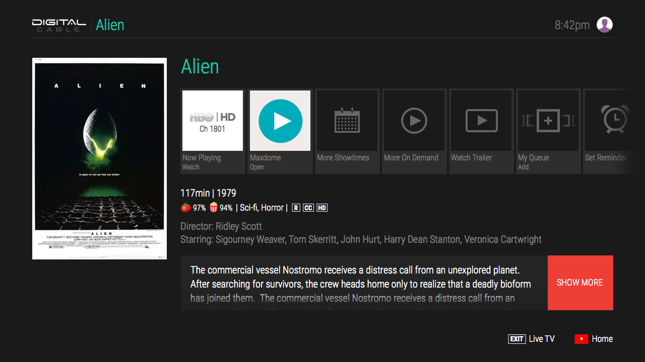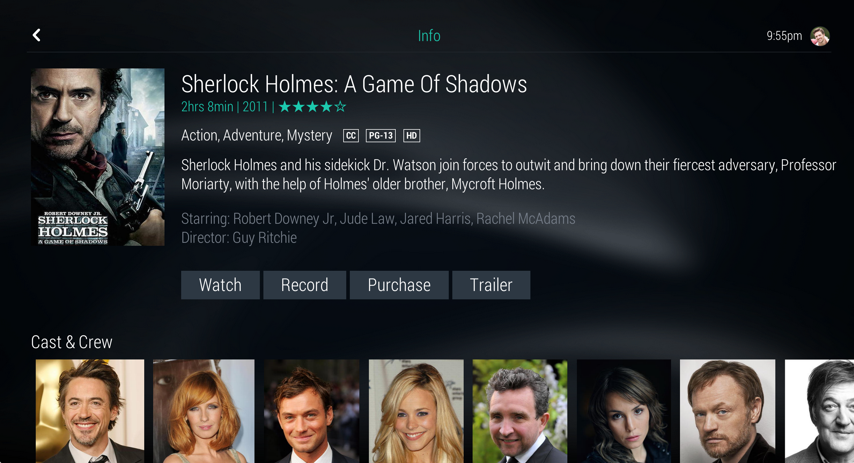 The detail screens had to be be designed in a way to accommodate many combinations of channels, recording options, reminders, trailers, and on demand services. Other data that was available, but not always present, was show descriptions or celebrity bios, photos, cast and crew, and recommended/similar titles. TV shows allowed for browsing additional episodes as well.