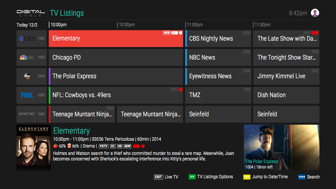 Starting with the design concepts, I modified them to allow for extensive remote (D pad style) navigation, highlighting anything that was selectable in the primary color while retaining context for location with a faded primary color when entering a subsection or menu. Badges on TV shows in the guide provide important information about whether an episode is new, is set to record a single episode or series, or has a reminder to watch set. Slide out and stacking panels (from the right of the screen) were used to keep context with the main underlying screens, allowing for more info and configuration changes to happen in place with out navigating away from the content. On screen contextual buttons (at the bottom of the screen) mapped to physical buttons on the remote to allow quick access to functions without having to navigate by arrow keys across many selectable areas on screen.