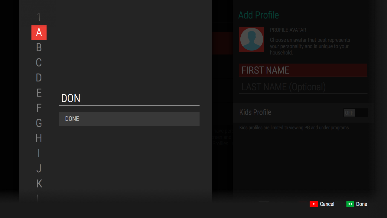 Settings required several new patterns when it came to profile creation and management. The on screen keyboard designed for search was able to be reused here for name entry. A selection of profile icons in different colors provided a quick reference in the upper right of the screen as to which profile was currently active.