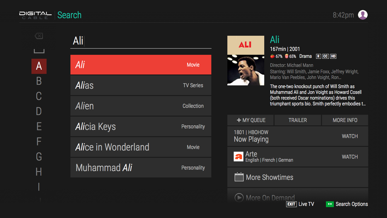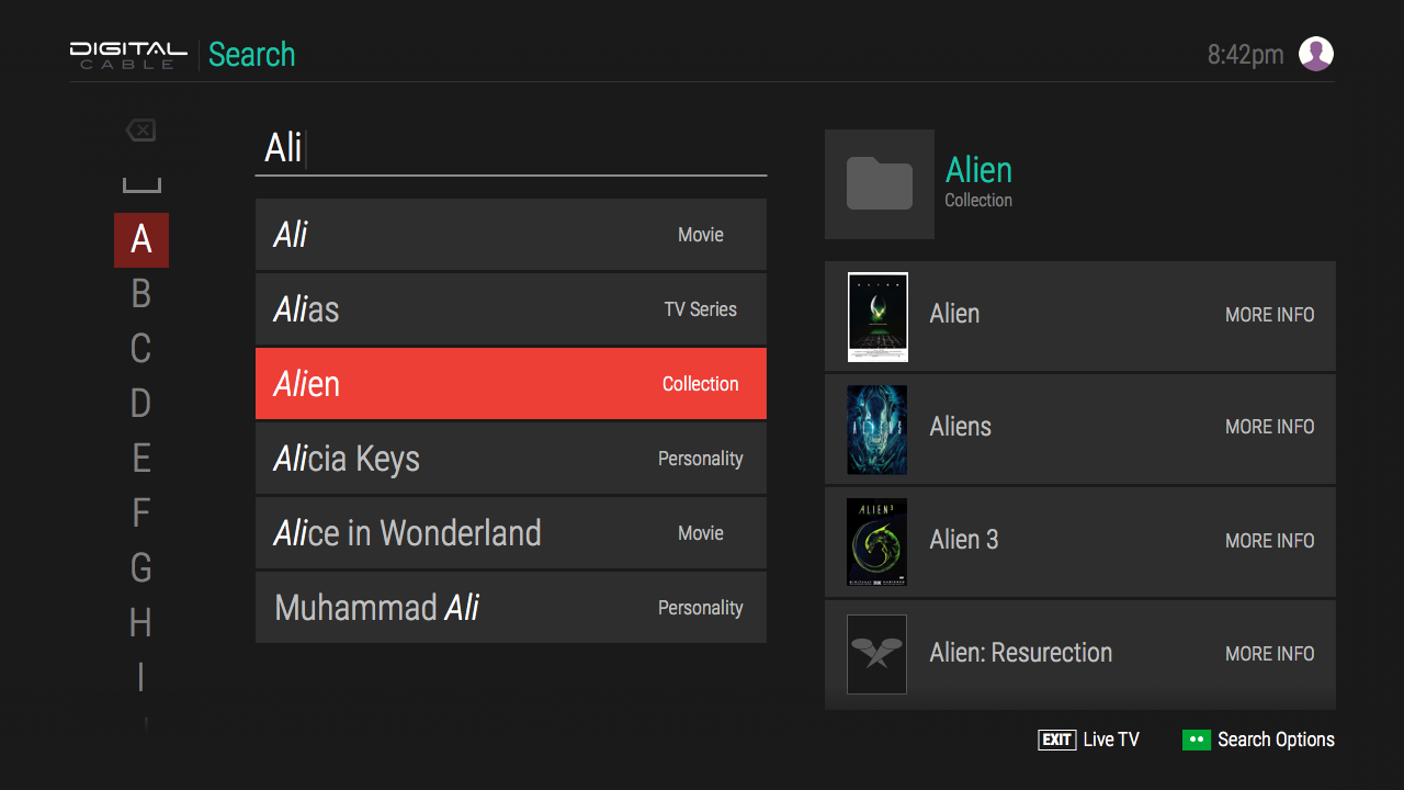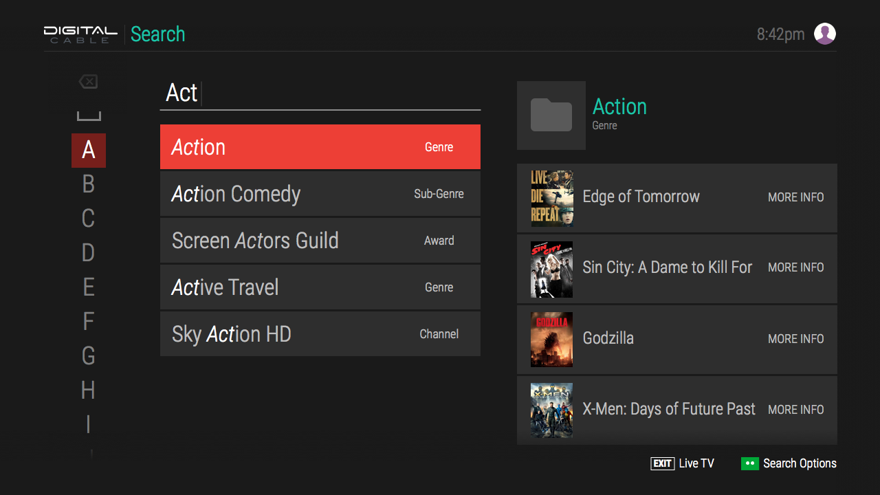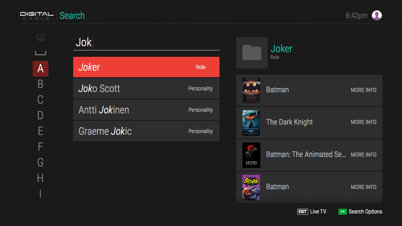 Several on screen keyboards and layouts were tested but ultimately a vertical keyboard was chosen to continue the left to right section/detail paradigm used on other screens. After each character was selected on the keyboard, a search was run, returning relevant data in many different categories. Information returned included, TV series, movies, collections, personalities, channels, roles, genres, sub-genres, decades, and languages. Each type of selection would yield different browsable data. This leaned heavily on the Rovi TV API that many companies licensed for its wealth of data. Search would essentially allow you to browse the entire Rovi database, returning relevant TV and Movies that you could watch with just a tap.